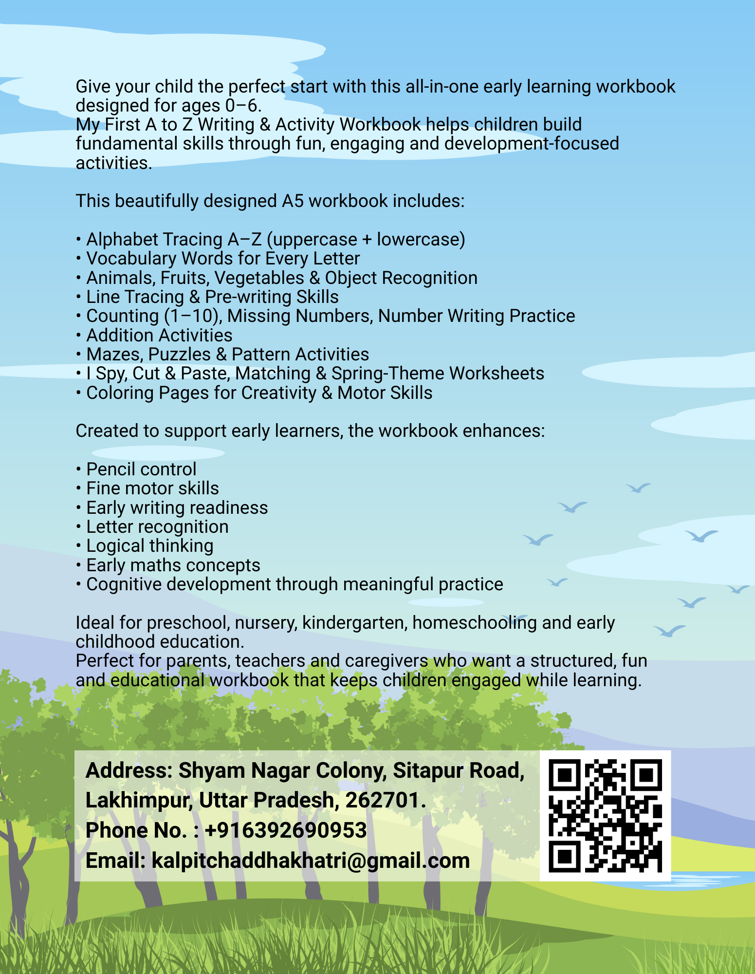 Give your child the perfect start with this all-in-one early learning workbook designed for ages 0–6. My First A to Z Writing & Activity Workbook helps children build fundamental skills through fun, engaging and development-focused activities. This beautifully designed A5 workbook includes: • Alphabet Tracing A–Z (uppercase + lowercase) • Vocabulary Words for Every Letter • Animals, Fruits, Vegetables & Object Recognition • Line Tracing & Pre-writing Skills • Counting (1–10), Missing Numbers, Number Writing Practice • Addition Activities • Mazes, Puzzles & Pattern Activities • I Spy, Cut & Paste, Matching & Spring-Theme Worksheets • Coloring Pages for Creativity & Motor Skills Created to support early learners, the workbook enhances: • Pencil control • Fine motor skills • Early writing readiness • Letter recognition • Logical thinking • Early maths concepts • Cognitive development through meaningful practice Ideal for preschool, nursery, kindergarten, homeschooling and early childhood education. Perfect for parents, teachers and caregivers who want a structured, fun and educational workbook that keeps children engaged while learning.