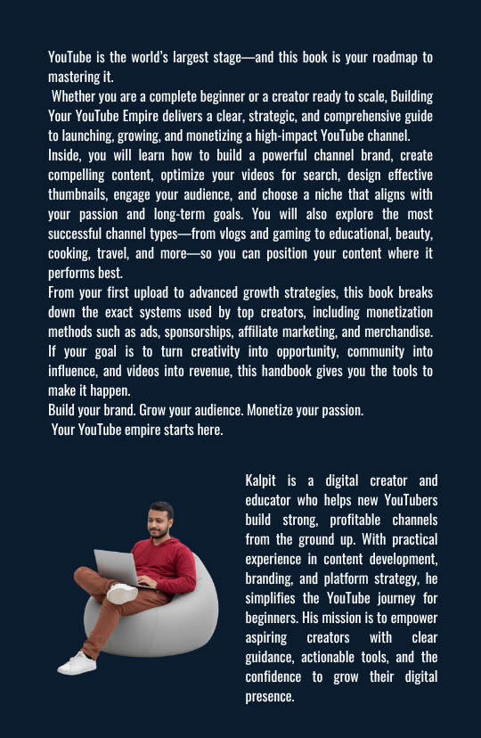 YouTube is the world’s largest stage—and this book is your roadmap to mastering it. Whether you are a complete beginner or a creator ready to scale, Building Your YouTube Empire delivers a clear, strategic, and comprehensive guide to launching, growing, and monetizing a high-impact YouTube channel. Inside, you will learn how to build a powerful channel brand, create compelling content, optimize your videos for search, design effective thumbnails, engage your audience, and choose a niche that aligns with your passion and long-term goals. You will also explore the most successful channel types—from vlogs and gaming to educational, beauty, cooking, travel, and more—so you can position your content where it performs best. From your first upload to advanced growth strategies, this book breaks down the exact systems used by top creators, including monetization methods such as ads, sponsorships, affiliate marketing, and merchandise. If your goal is to turn creativity into opportunity, community into influence, and videos into revenue, this handbook gives you the tools to make it happen. Build your brand. Grow your audience. Monetize your passion. Your YouTube empire starts here.